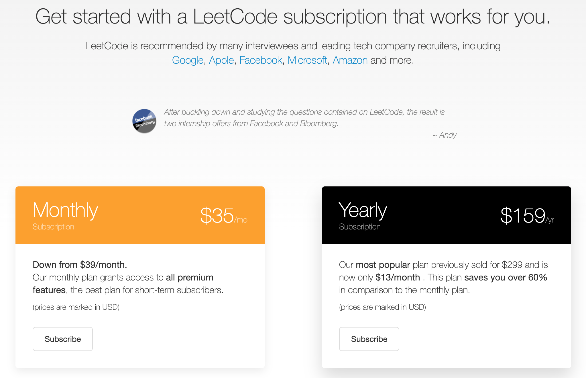 1년을 끊으면 159 달러인데, 한달에 15000원 정도이다.(블랙프라이데이에 항상 129달러로 할인한다) 반면에 한달 두달 세달만 신청하면 각 달에 35달러 즉 4만원 정도인데, 4달만 할거여도 1년신청해두는것이 낫다. 그리고 한번 합격을 하면 이용하지 않을것 같아서, 달별로 신청하여 비용을 아끼고자 하는 마음이 들수도있지만, 해외의 경우에는 취업후 2년재직하는것이 한국에서 7년정도 다닌것 같은 느낌이랄까...(저사람 참 오래 다니네)이런 느낌이다. 보통 6개월이나 1년선에서도 내부팀이동이나, 다른 회사로 이동도 많이 한다. 내부 팀이동때는 또 이런 인터뷰 루프를 거쳐야 하기 때문에 이왕 시작하면 1년 신청해두고, 합격을 하더라도 힘을내서 어느정도는 본인의 레벨을 올려두고 마무리 하는게 필요하기 때문에 1년을 추천한다.