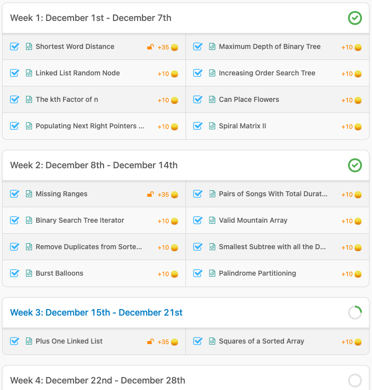 리트코드에서 12월 한달동안 하루에 한개의 문제를 푸는 챌린지를 완료했다. 내가 이런걸 할수 있을거라고 상상도 못했는데, 하고 나니까 성취감도 있고, 기분도 완전 좋다. 그리고 다양한 문제