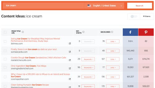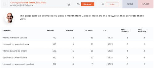 Step #3 - Pick one of the top blog posts you wish was on your site. Look for a good number of estimated visits (at least 75), a decent total backlink count (at least 10) and social shares. For this example, I'm going to pick "One Ingredient Ice Cream, Five Ways".