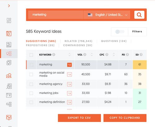 # 4 단계-키워드를 CSV로 내보내고 마스터 타겟 목록을 만듭니다. 검색 난이도가 낮은 "SD"키워드는 순위를 매기기가 더 쉽습니다. 따라서 먼저 대상을 지정하는 것이 좋습니다.