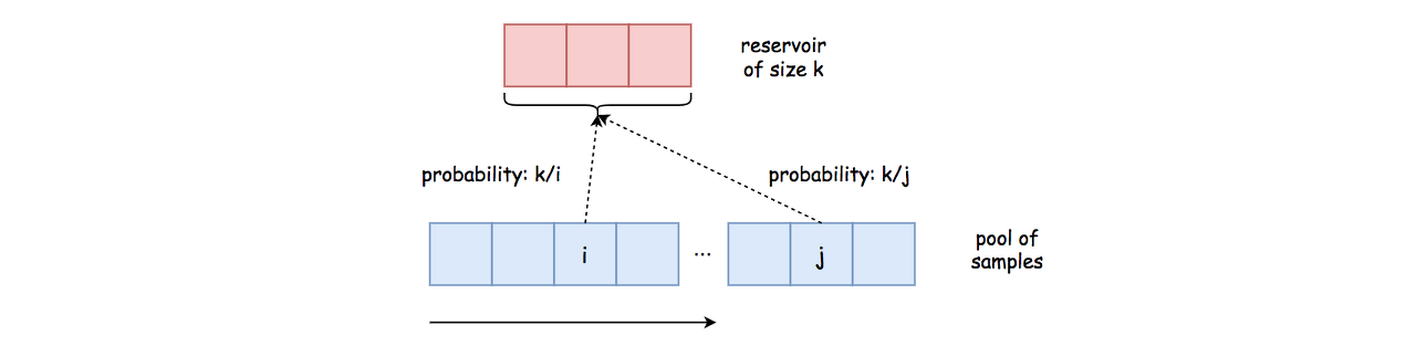 Later on, there is a chance that any chosen element in the reservoir might be replaced with the subsequent element. More specifically, when we reach the element j (j > i), there would be a chance of \frac{1}{j}j1 for any specific element in the reservoir to be replaced. Because for any specific position in the reservoir, there is \frac{1}{j}j1 chance that it might be chosen by the random number generator. On the other hand, there would be \frac{j-1}{j}jj−1 probability for any specific element in the reservoir to stay in the reservoir at that particular moment of sampling.