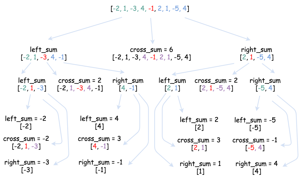 cross_sum = maximum sum of the subarray containing elements from both left and right subarrays and hence crossing the middle element at index (left + right) / 2.