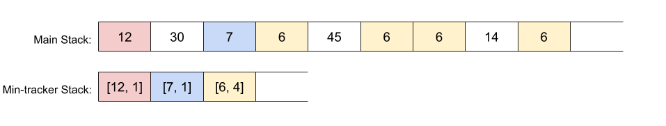 An improvement is to put pairs onto the min-tracker Stack. The first value of the pair would be the same as before, and the second value would be how many times that minimum was repeated. For example, this is how the min-tracker Stack for the example just above would appear.