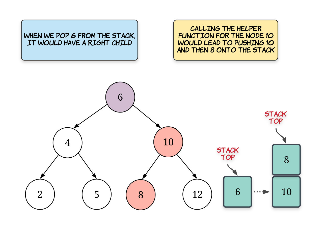 Second is where the node has a right child. We don't need to check for the left child because of the way we have added nodes onto the stack. The topmost node either won't have a left child or would already have the left subtree processed. If it has a right child, then we call our helper function on the node's right child. This would comparatively be a costly operation depending upon the structure of the tree.