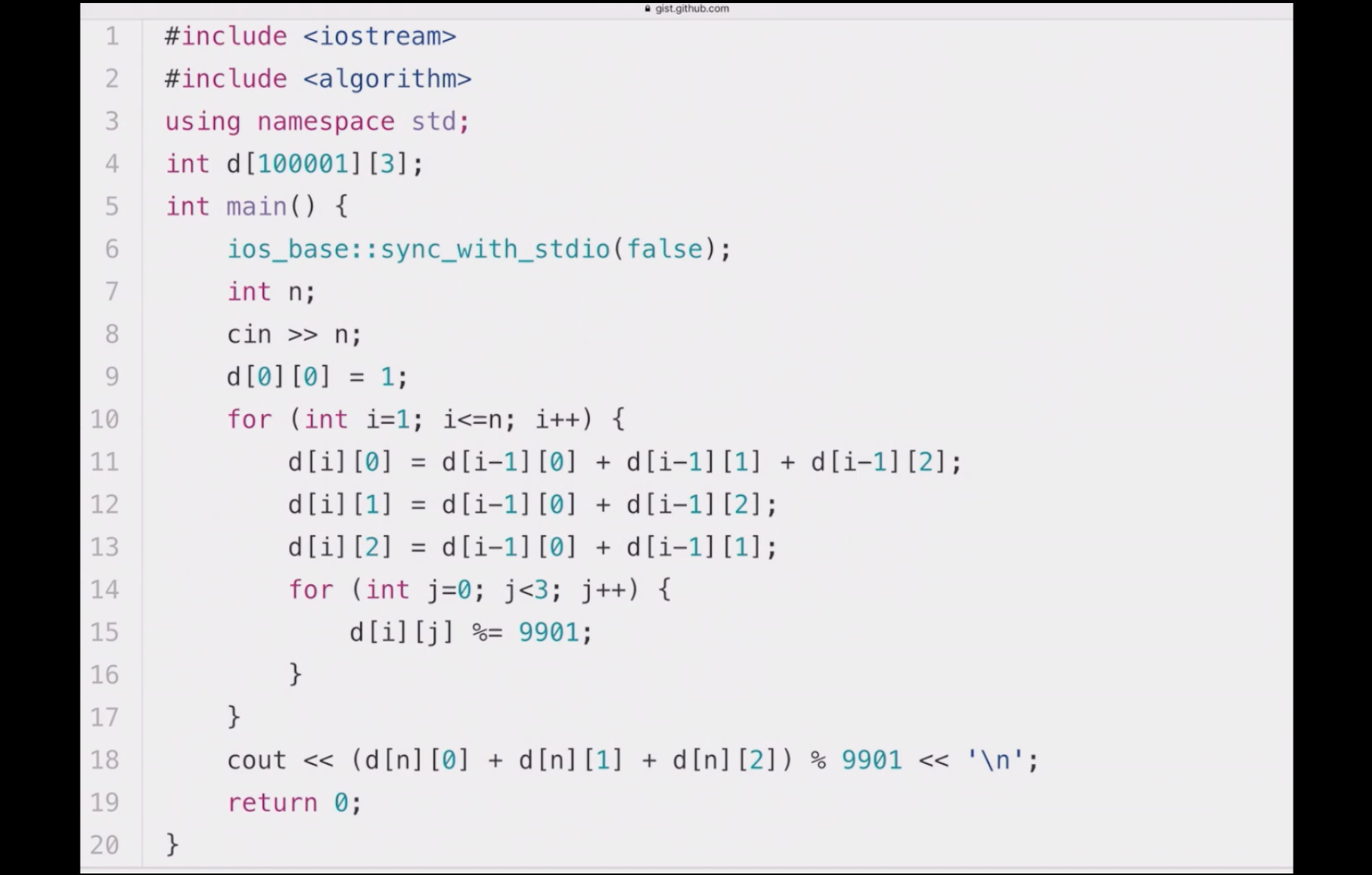 첫째 줄에 사자를 배치하는 경우의 수를 9901로 나눈 나머지를 출력하여라. <- 이말은 출력의 첫째줄에 경우의 수의 결과를 쓰라는것이다.