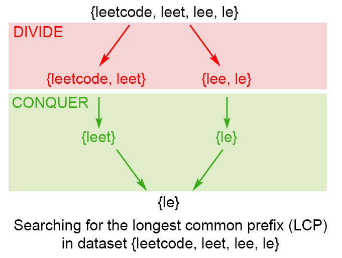 The idea of the algorithm comes from the associative property of LCP operation. We notice that : LCP(S_1 \ldots S_n) = LCP(LCP(S_1 \ldots S_k), LCP (S_{k+1} \ldots S_n))LCP(S1…Sn)=LCP(LCP(S1…Sk),LCP(Sk+1…Sn)) , where LCP(S_1 \ldots S_n)LCP(S1…Sn) is the longest common prefix in set of strings [S_1 \ldots S_n][S1…Sn] , 1 < k < n1<k<n