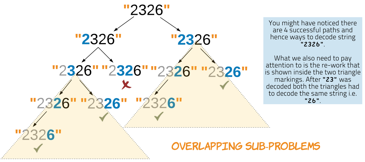 From the solutions discussed above, we can observe that the number of decodings possible upto any index, ii, is dependent only on the characters upto the index ii and not on any of the characters following it. This leads us to the idea that this problem can be solved by making use of Dynamic Programming.