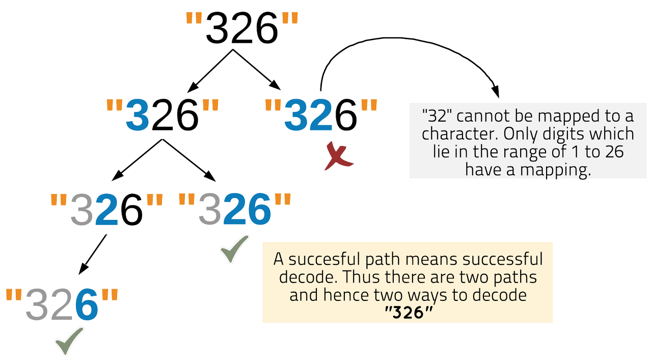 Thus at any given time for a string we enter a recursion after successfully decoding two digits to a single character or a single digit to a character. This leads to multiple paths to decoding the entire string. If a given path leads to the end of the string this means we could successfully decode the string. If at any point in the traversal we encounter digits which cannot be decoded, we backtrack from that path.