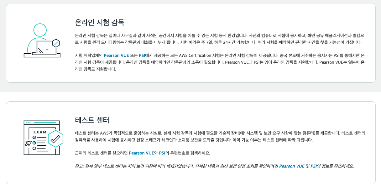 AWS 자격증 시험의 방법은 온라인과 테스트센터 2가지로 제공된다.