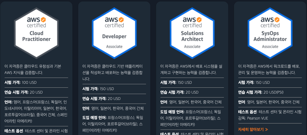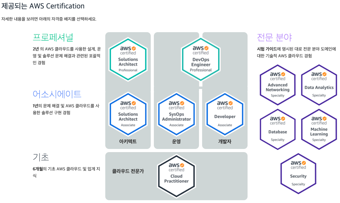 AWS 자격증은 기초/어소시에이트/프로페셔널 3가지 레벨로 구성되어 있습니다. 비전공자분들께서 많이들 취득하시는 클라우드 전문가(AWS Cloud Practicioner)이 기초 레벨의 자격증 입니다. 어소시에이트는 아키텍트/운영/개발자 3가지로 나누어지며, 주니어-미드 레벨의 실무경험이 있다면 어렵지 않게 취득할 수 있다고 생각합니다. 프로페셔널의 경우네느 아키텍트/운영+개발 두가지로 나누어지는데, 많은 지식과 경험이 필요하며 시니어 실무경험이 있으면 시험범위를 이해하고 문제를 해결하는데 많은 도움이 된다고 생각합니다.
