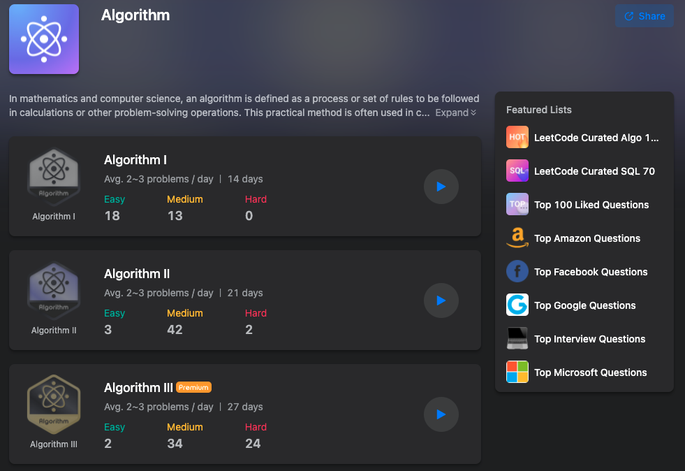 리트코드 스터디플랜 - 알고리즘 편을 들어다 보자. 이 스터디 플랜은 총 14일동안 진행되는것으로 구성되어 있고, 매일매일 2~3문제를 풀어야 해서 만만치 않은것 같다. 개인적인 느낌으로는 풀