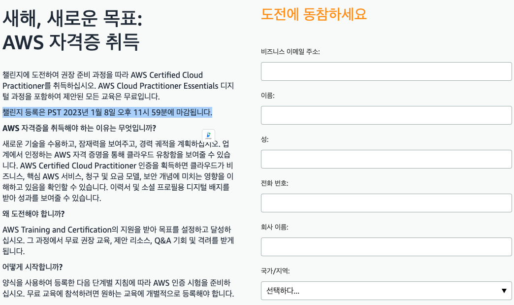 다음은 AWS 클라우드 프랙티셔너 자격증 챌린지에 대해 AWS에서 제공하는 공식 설명입니다.