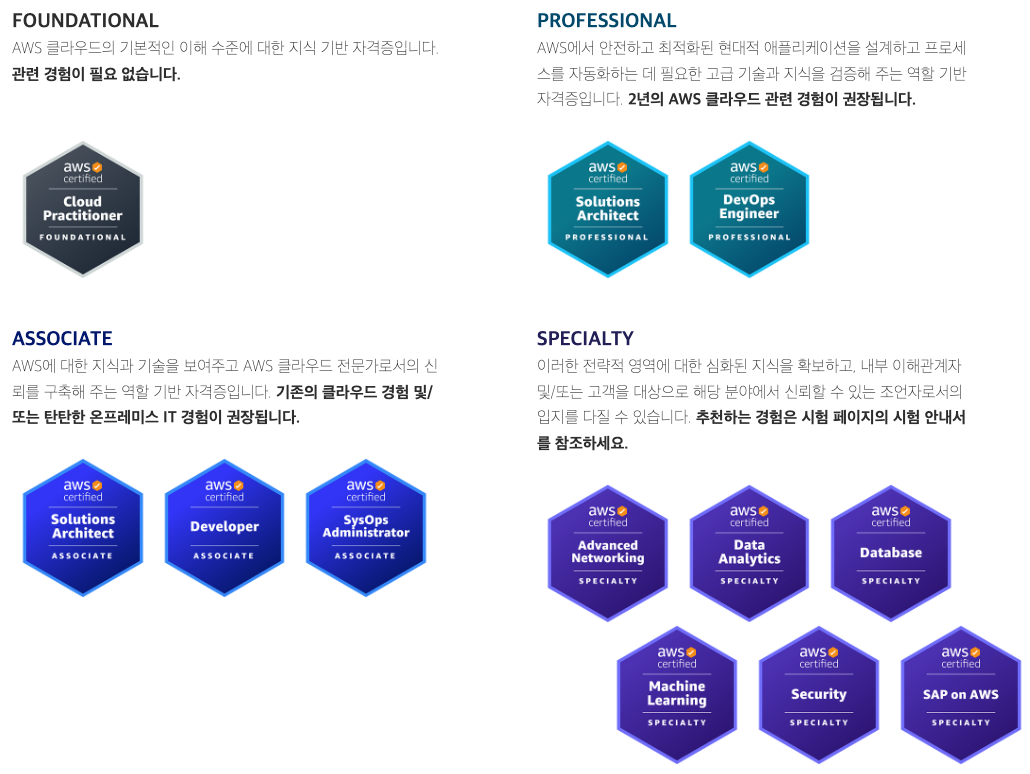 아래의 관련 설명을 읽어보시면 알 수 있듯이, 자격증 레벨은 크게 파운데이셔널 -> 어소시에이트 -> 프로페셔널로 구성되며, 추가적으로 각 특화 영영역에 해당하는 스페셜티 자격증이 있습니다.