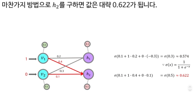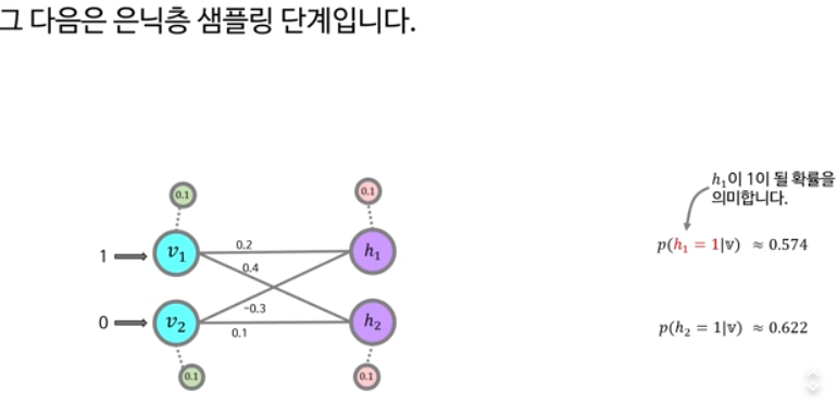 아까 RBM의 노드들은 0 혹은 1의 값을 가진다고 했는데, h1이 1이 될 확률이 0.574이라 1이되며, 따라서 h1의 샘플링 값은 1이 된다.