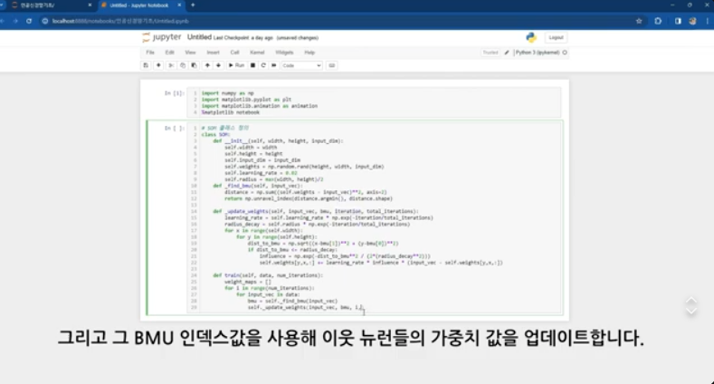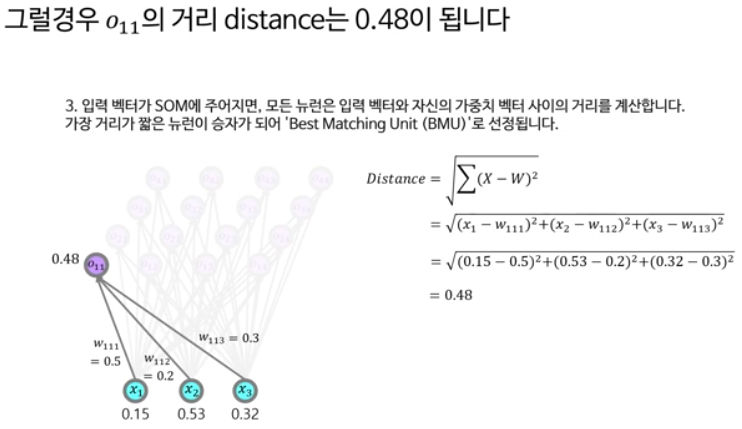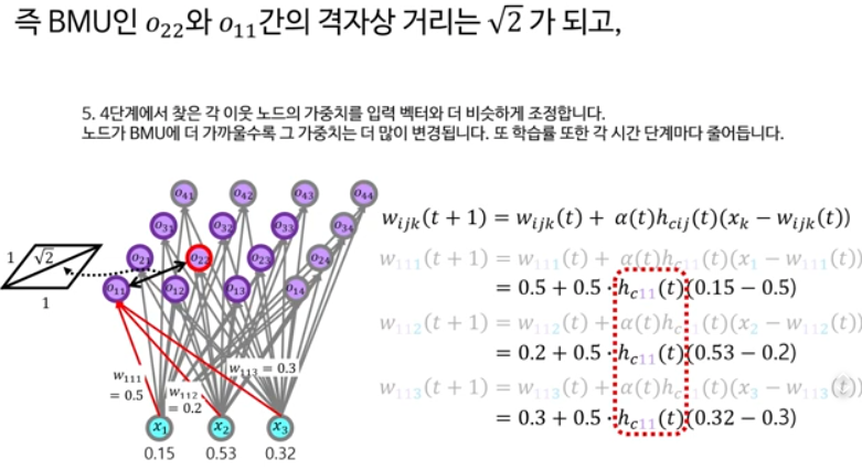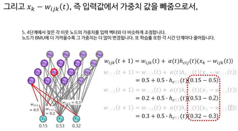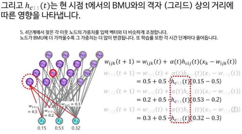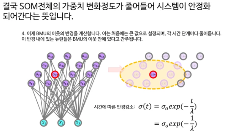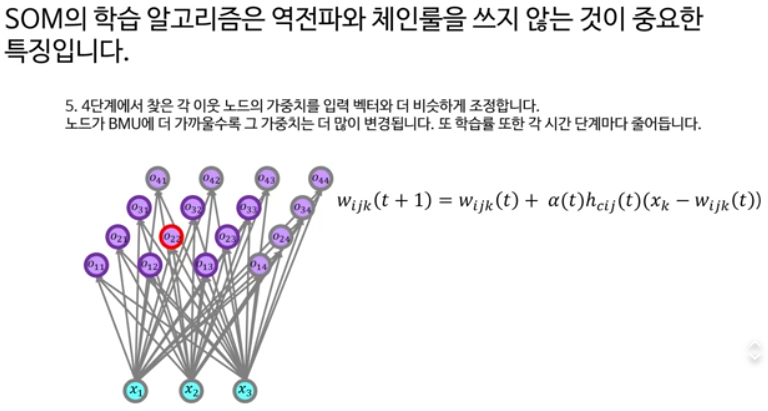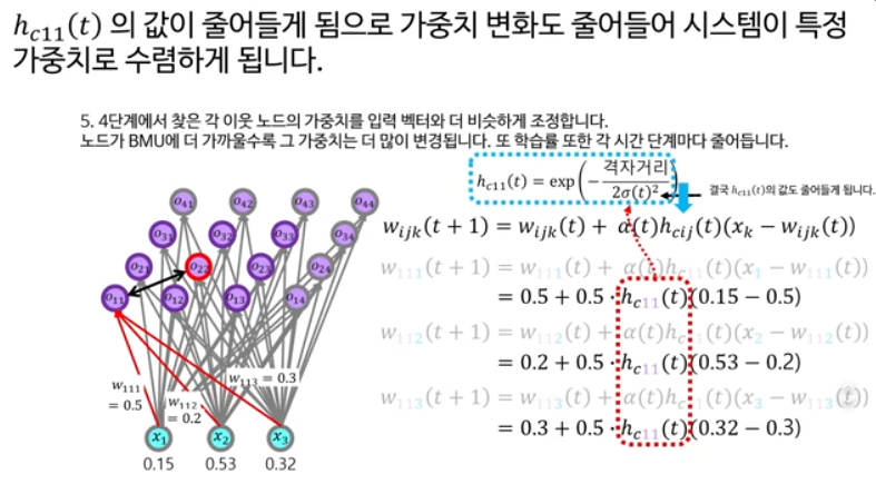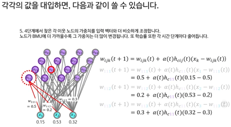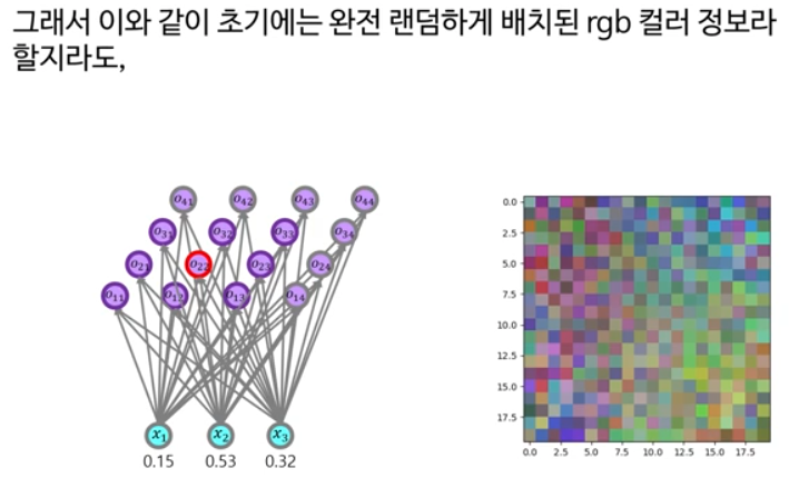 - 사탕 데이터를 하나하나 반복해서 넣고,매번 ‘가장 비슷한’ 노드와 그 주변 노드의 값을입력 사탕 데이터 쪽으로 조금씩 이동