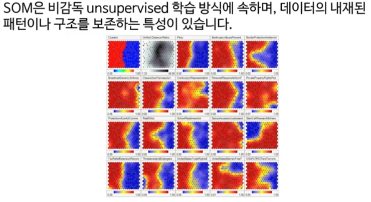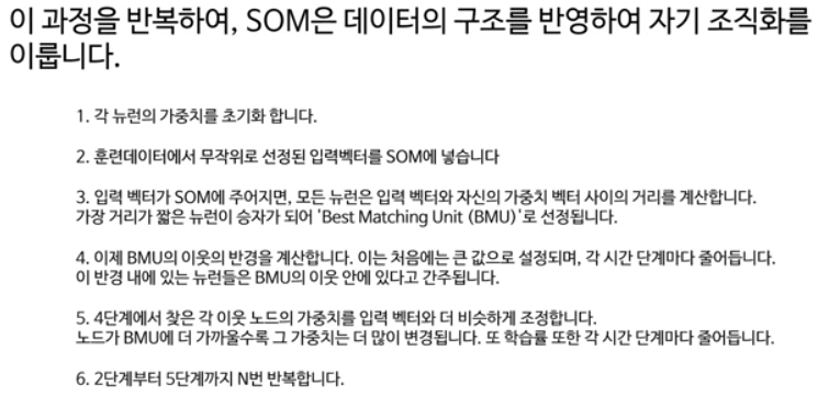요약:처음부터 꽃 하나만 대표로 삼는 게 아니라많은 꽃 데이터를 반복적으로 비교·학습하면서“분포 전체를 대표하는 꽃들”이 만들어지는 게 바로 SOM의 핵심이에요!그래야 각기 다른 종류, 특성을 가진 새로운 꽃이 들어와도자동으로 가까운 그룹(노드)과 연결되어 분류·군집화가 잘 되는 지도/구조를 얻을 수 있습니다.