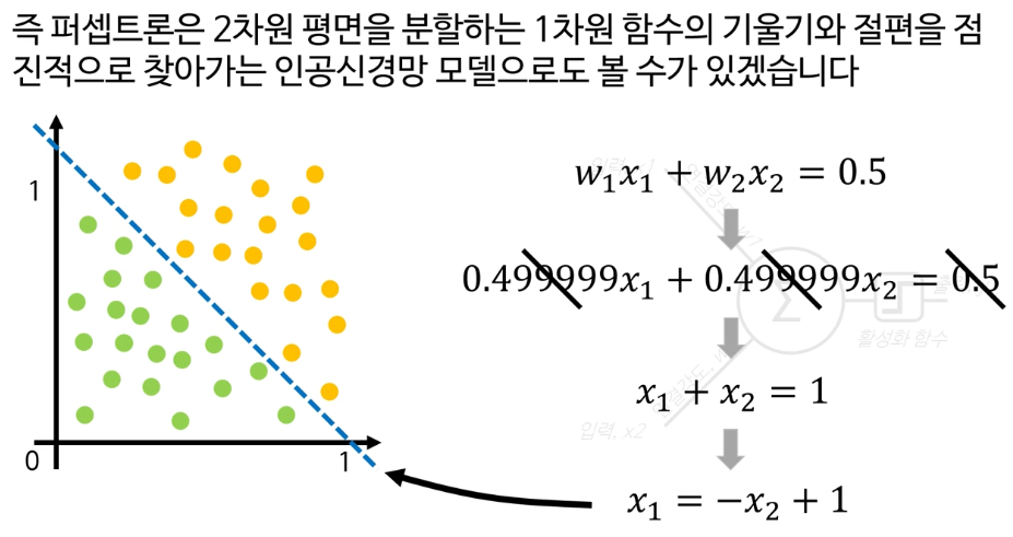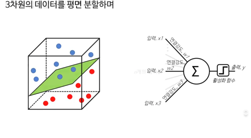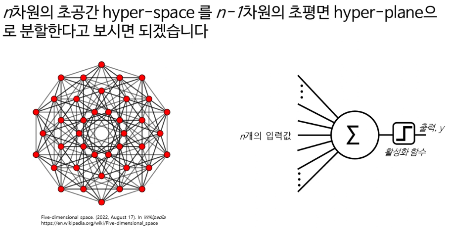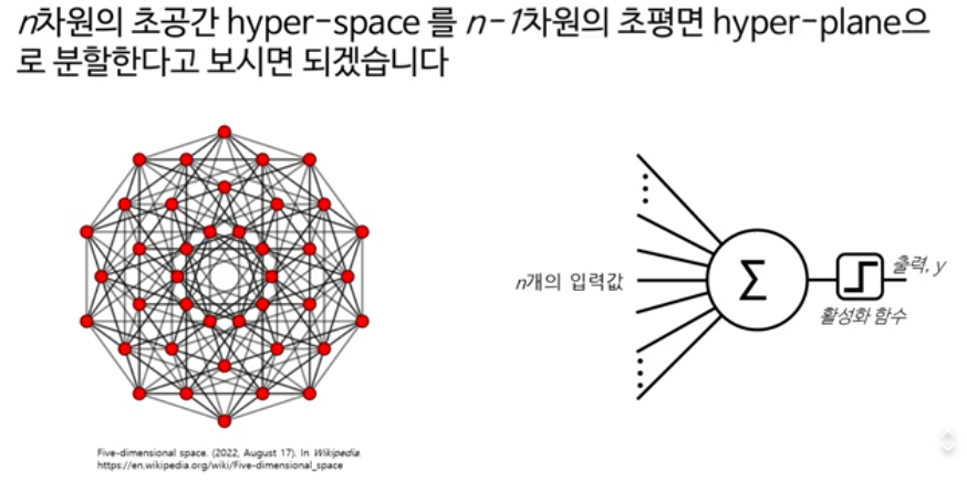 - 그래서 “$n$차원의 초공간을 $n-1$차원의 초평면으로 분할한다”는 말은, 입력벡터가 사는 $n$차원 특징 공간을 하나의 선형 결정경계로 둘로 나눈다는 의미입니다.