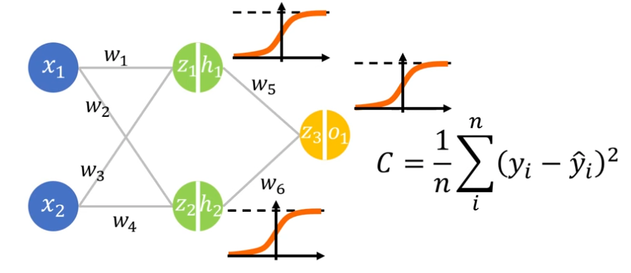 즉, 손실 C=(y−o 1 )제곱 는 “정답 y와 예측 o 1 의 차이 제곱”이 되는 것.