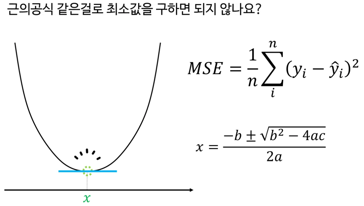 손실함수는 그냥 제곱이 있는 2차함수일 뿐인데, 그냥 편하게 근의공식 같은걸로 최소값을 구하면 되지 않나요?