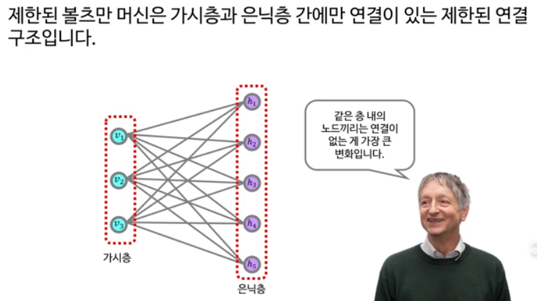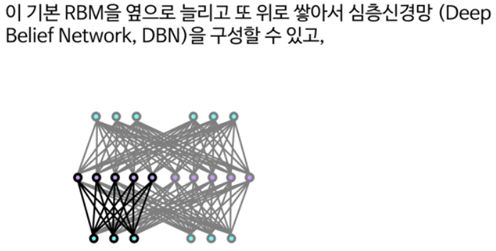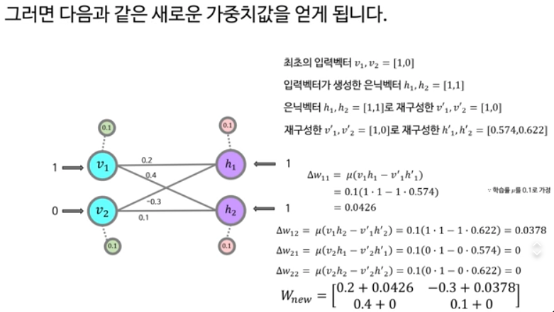이와 같은 방식으로 데이터 값들을 입력하고 재구성한 뒤 가중치를 업데이트 해주는 것이 RBM의 학습 알고리즘.