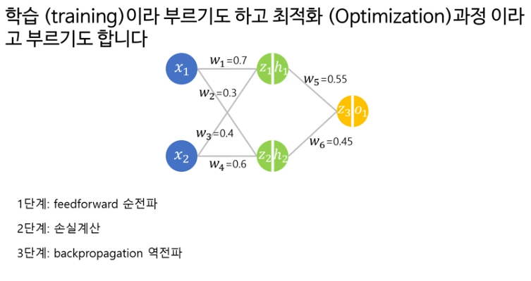 1단계부터 3단계를 반복해서 최적의 파라미터를 찾아가는 과정을 학습(트레이닝) 또는 최적화라고 부른다