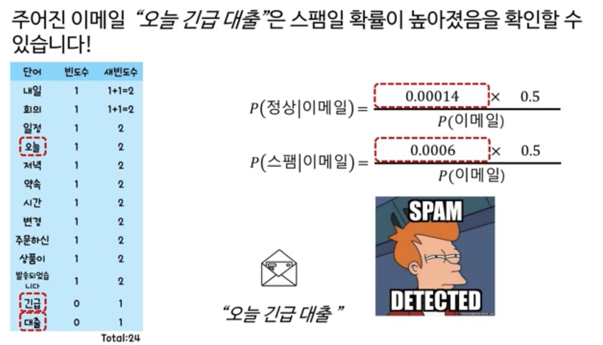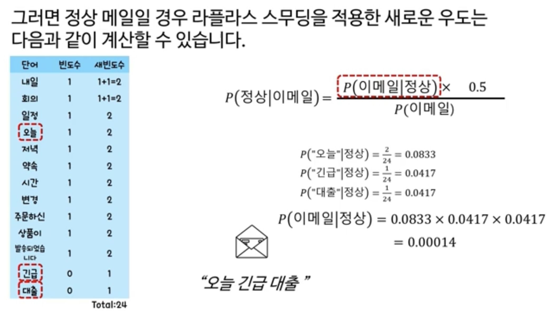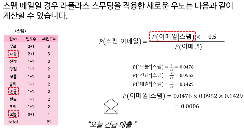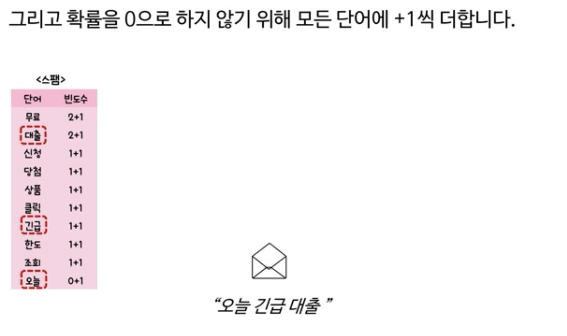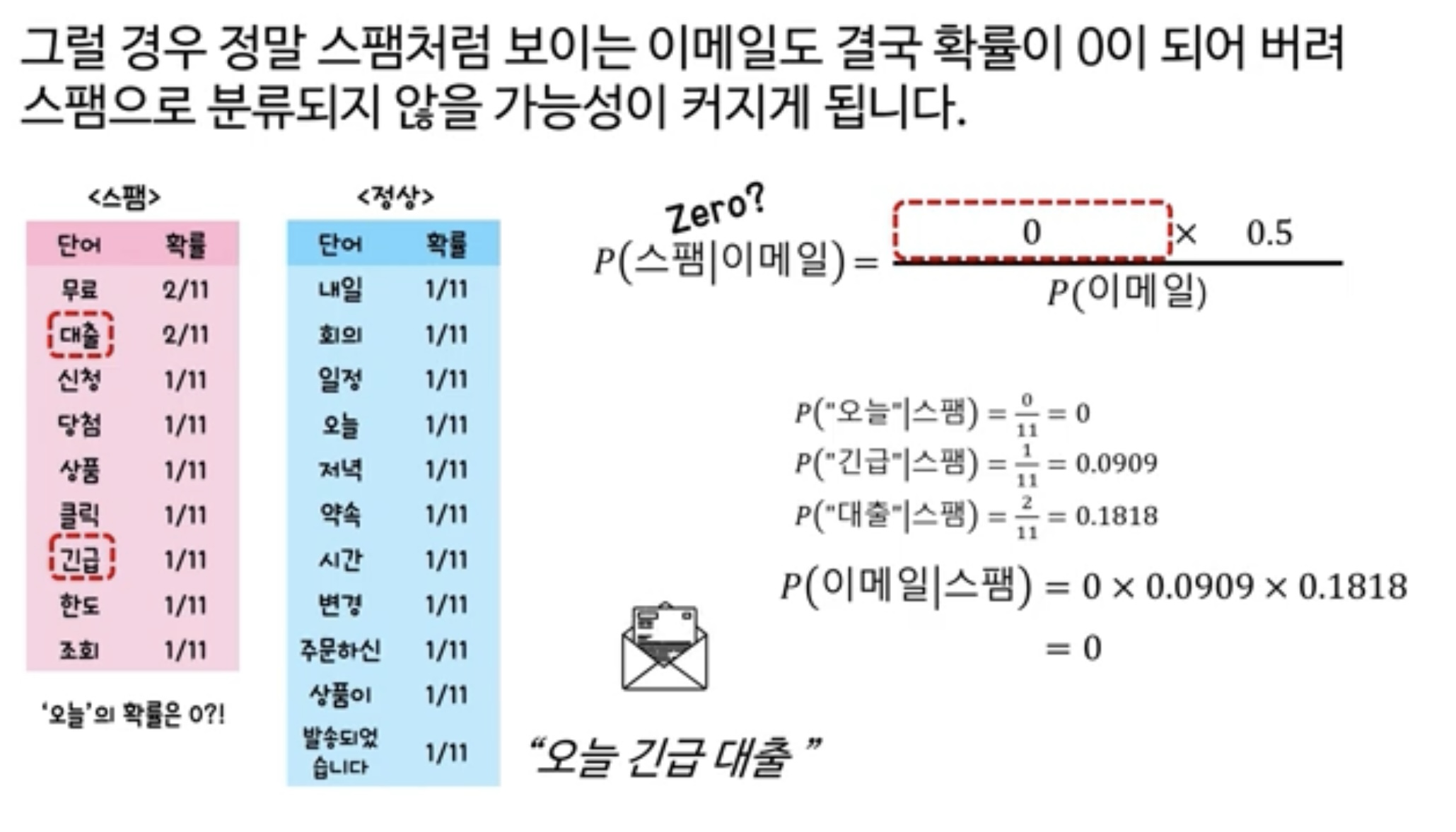 "오늘 긴급 대출" 일 경우 '오늘'이 스팸에서 0이 되기 때문에 확률을 다 곱한 우도 또한 0이 될것이고,