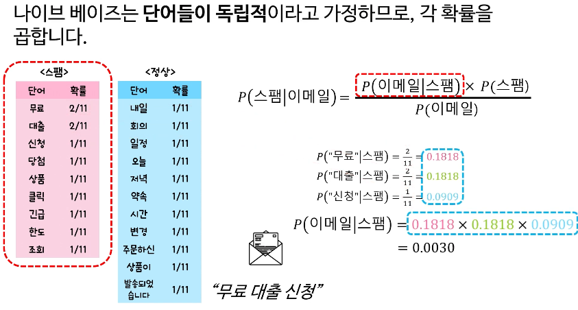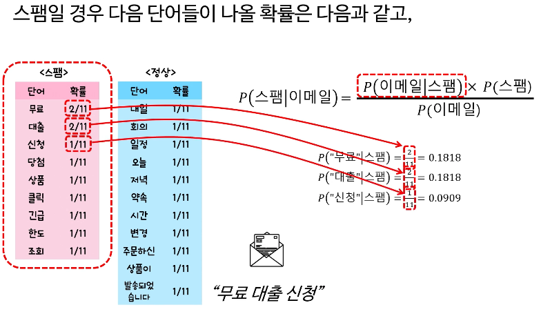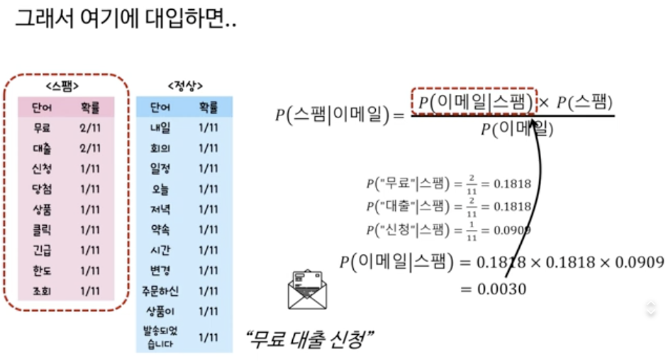 왼쪽은 p(스팸|이메일) 이라고 조건부확률이라는 것인데 '어떤 이메일이 왔을 때, 그 이메일이 스팸메일일 확률'