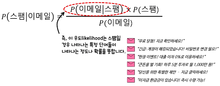 아래 그림에서 위의 빨간 동그라미: 우도 Likelyhood - 주어진 이메일이 스팸이라 할 때, 그 이메일의 단어 패턴이 얼마나 스팸 메일의 패턴을 따르는 지를 보여주는 지표입니다.