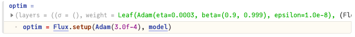 Flux는 Optimisers.jl 에서 그래디언트 기반 최적화기를 다시 내보냅니다. 이는 숙제 3에서 접했던 내용입니다. 여기서는 모델에서 Adam을 초기화합니다.