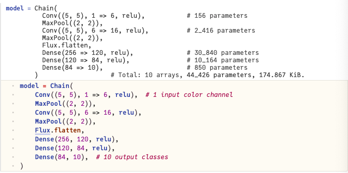 간단한 합성곱 신경망인 LeNet-5 아키텍처를 구현해 보겠습니다 . 모든 계층이 순차적으로 적용되므로, 이를 하나의 에 넣을 수 있습니다 Chain.