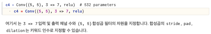 이 강의 서두에서 언급했듯이 Flux.jl은 일반적인 딥러닝 추상화를 제공합니다. 이러한 추상화에는 다음과 같은 내장 레이어가 포함됩니다 .