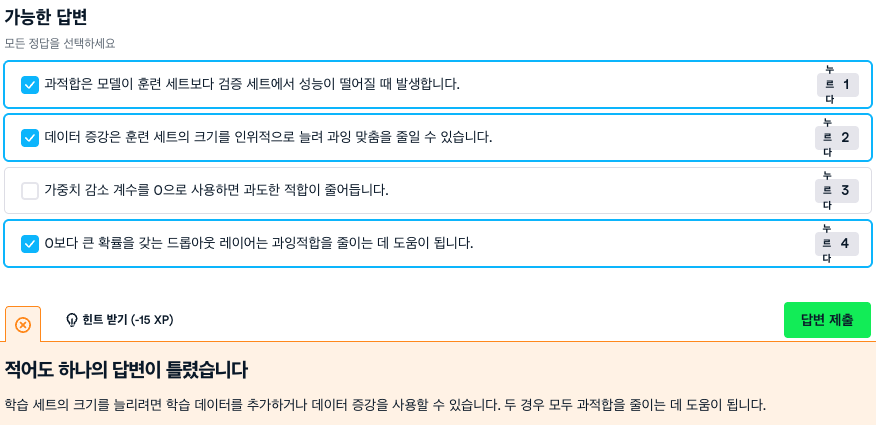 과잉적합은 모델이 보이지 않는 데이터로 일반화되지 않을 때 발생한다는 점을 기억하세요.