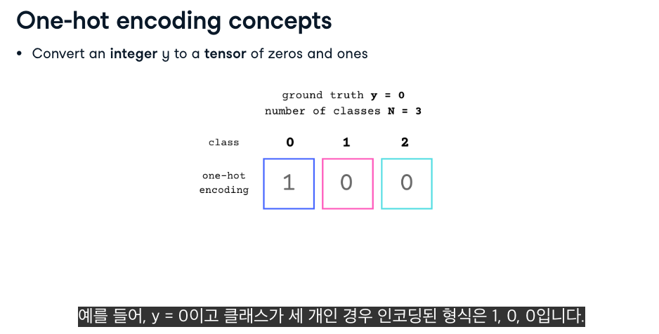 - 예를 들어, 3개의 클래스가 있다면 정답 클래스의 위치만 1이고 나머지는 0이 되는 벡터입니다.