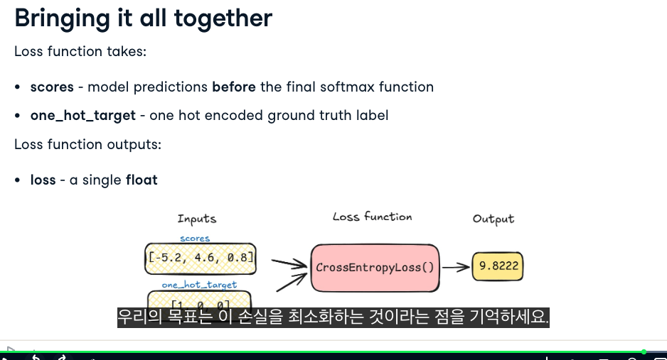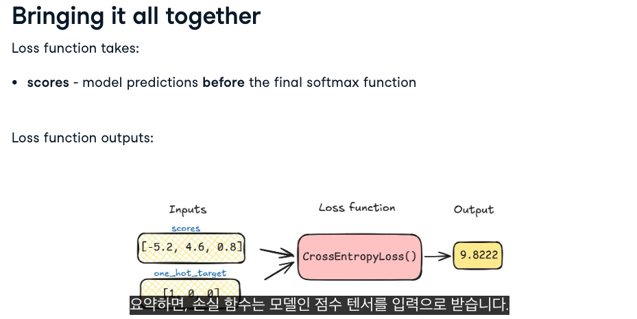 - 즉, 직접 소프트맥스를 적용하지 않고 원시 점수(scores, 로짓)만 주면 CrossEntropyLoss가 알아서 softmax와 log 연산을 처리해줍니다.