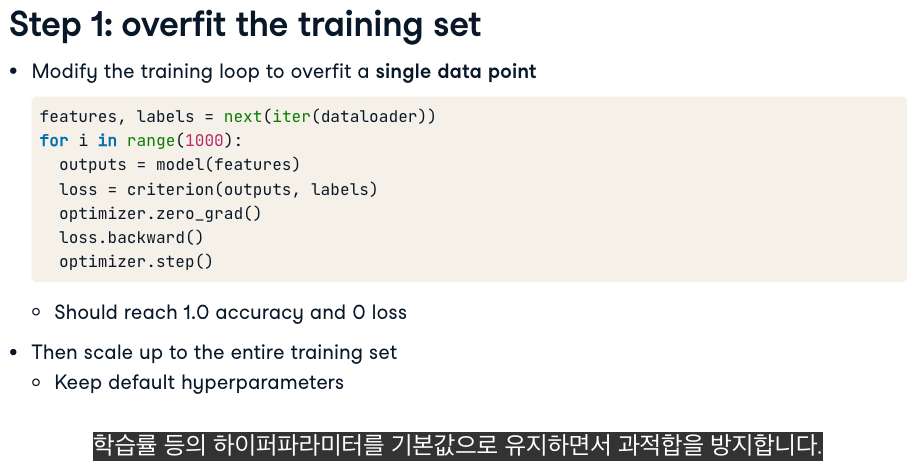 | calculate loss | 모델의 예측값과 실제값을 비교해 "오차(손실)"를 정량적으로 계산 | loss = criterion(output, target) | 손실 함수 값(스칼라, 예를 들어 2.5) |