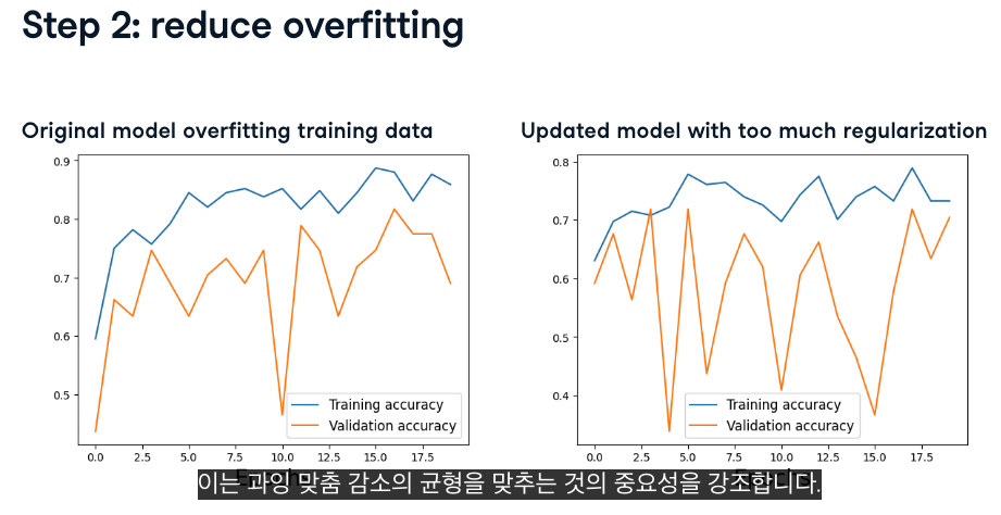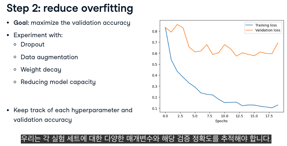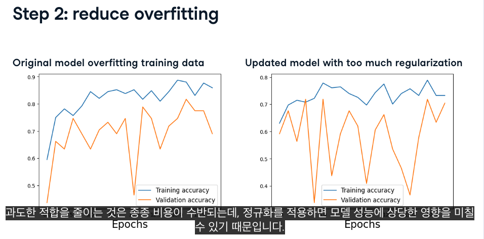 - 모델크기를 줄이거나 드롭아웃이라는 새로운 유형의 레이어를 추가합니다.