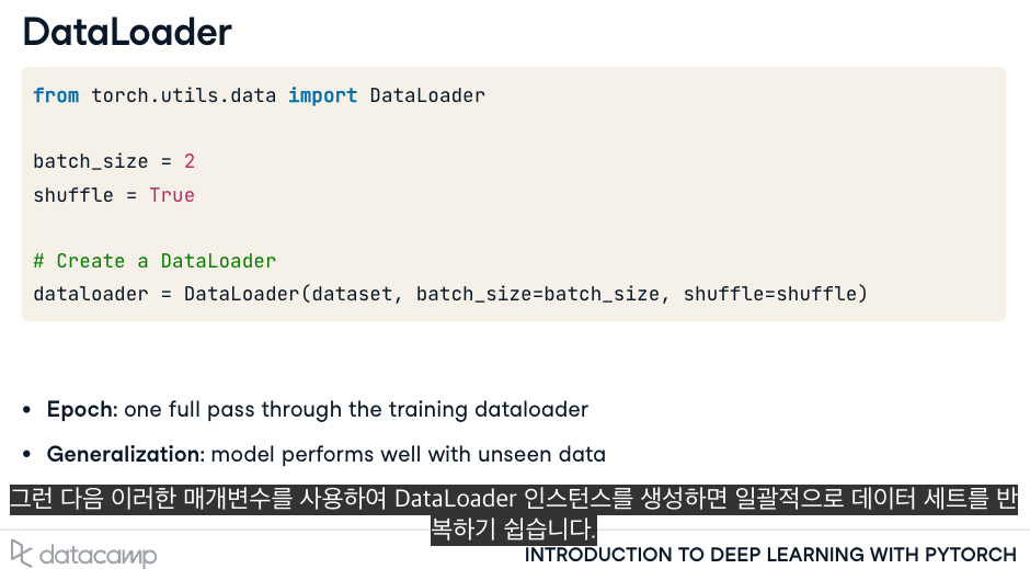 한 에포크는 훈련 데이터로더를 완전히 통과하는 것을 의미하며 일반화는 다음을 의미합니다.