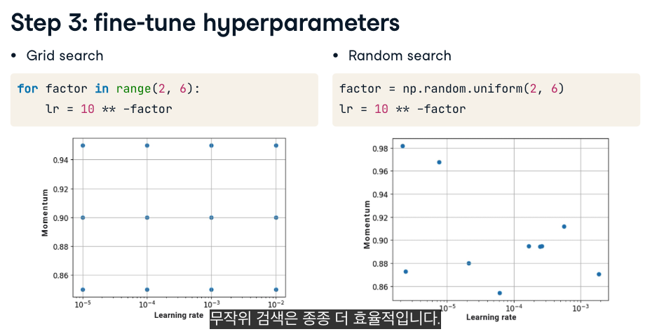 하이퍼파라미터 미세설정은, 학습 속도나 모멘텀과 같은 최적화 설정에서 종종 수행됩니다.