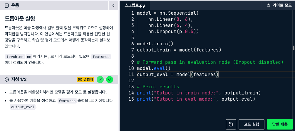 평가가 비활성화되어 모든 뉴런이 활성화되면 안정적인 예측이 보장됩니다. model.train()과 model.eval()으로 전환
