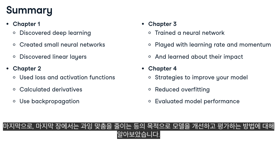 이제 신경망의 핵심 구성 요소를 배웠으니, 학습 루프를 사용하여 신경망을 학습해 보겠습니다. 기울기 소멸과 같은 잠재적인 문제를 살펴보고, 대체 활성화 함수 사용, 학습률 및 모멘텀 조정 등 이를 해결하는 전략을 알아봅니다.