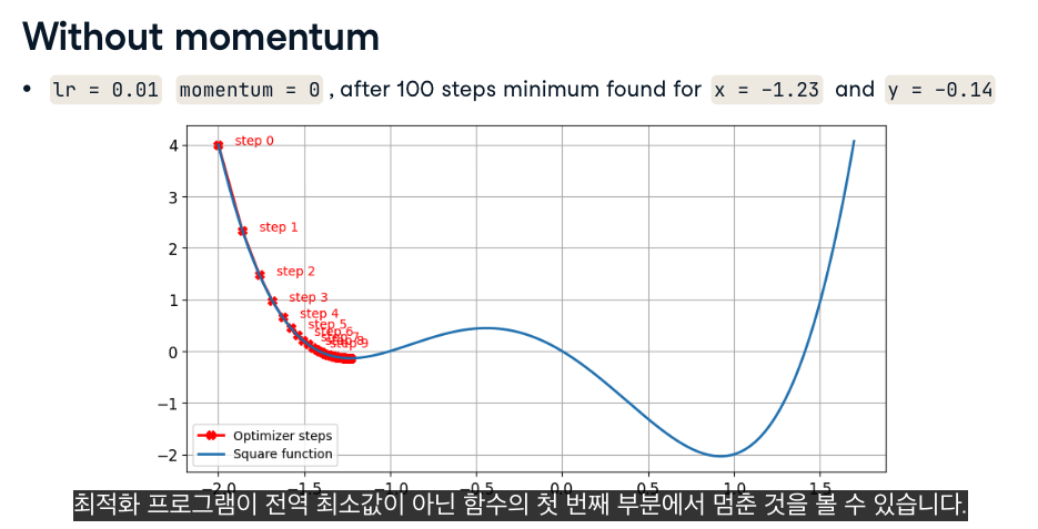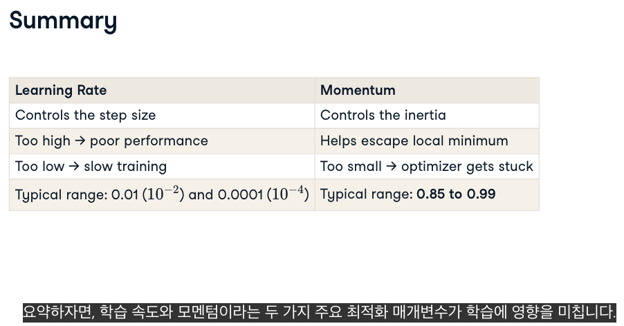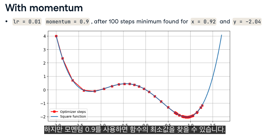 - 모멘텀 : 관성을 추가하여 최적화 프로그램이 원활하게 움직이고 멈추는데 도움을 줌