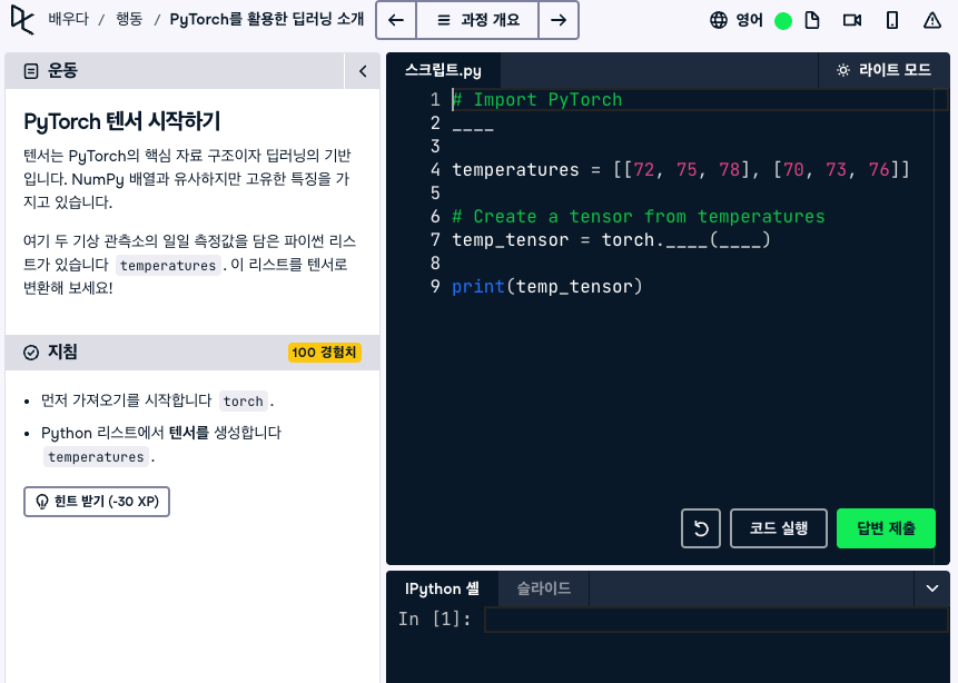 데이터캠프(Datacamp)는 데이터 과학과 분석 학습에 특화된 온라인 교육 플랫폼입니다. 사용자는 웹 브라우저만으로도 파이썬, R, SQL 등 다양한 언어를 학습할 수 있습니다. 실습 중심의 인터랙티브한 코딩 환경을 제공하기 때문에 별도의 프로그램 설치 없이 실시간으로 코드를 작성하고 실행할 수 있습니다.