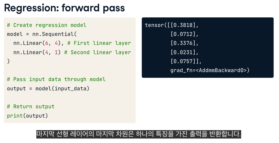 회귀의 경우 소프트맥스나 시그모이드 대신 선형계층을 최종 출력으로 사용합니다.