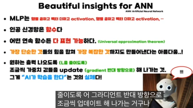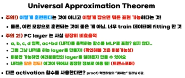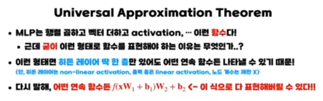 이 강의의 핵심은 “히든 레이어가 단 한 층만 있는 MLP도 노드 수만 충분히 많으면, 거의 어떤 연속 함수든 원하는 정확도로 근사할 수 있다(보편 근사 정리, Universal Approximation Theorem)”는 사실을 직관적으로 보여주는 것입니다.