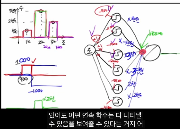 - 출력층에서 이 깍두기에 적절한 가중치를 곱해 더하면, 특정 구간에서 원하는 높이를 갖는 ‘막대’를 만들 수 있습니다.