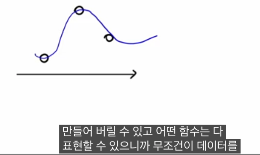 데이터 포인트가 (x i ,y i )로 주어졌을 때, 각 점 주변에 이런 작은 깍두기를 하나씩 세워서 높이를 y i 에 맞춰 주면, 합쳐진 함수가 모든 데이터를 정확히 지나가도록(트레인 로스 0) 만들 수 있습니다. 점들을 더 빽빽하게 잡으면, 코사인이나 다항식 같은 연속 함수의 그래프도 “깍두기 합”으로 점점 더 잘 근사할 수 있고, 그 깍두기 합을 1층 MLP가 구현하기 때문에 “어떤 연속 함수든 표현 가능하다”는 결론에 도달합니다.