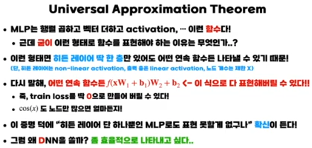 보편 근사 정리는 “표현력” 관점에서, 단 한 층만 있어도 충분하다는 존재 정리입니다. 하지만 강의에서도 강조하듯, 실제로는 다음과 같은 이유로 깊은 네트워크를 사용합니다.