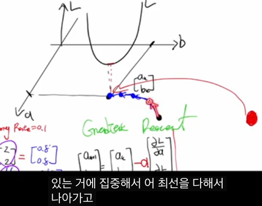 먼저 선형 회귀에서 로스 L(a,b)를 최소로 만드는 a,b를 찾고 싶은데, 모든 a,b 조합에 대해 로스를 계산해 보는 것은 파라미터 수가 많아지면(딥러닝 수백만–수억 개) 불가능합니다.