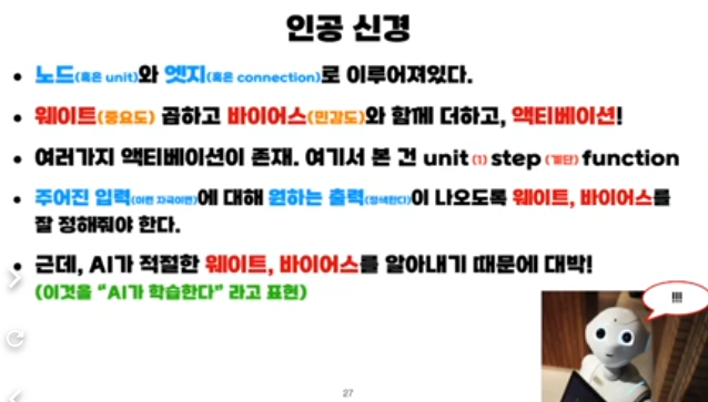 이 영상의 핵심은 “생물학적 신경을 비유로 삼아서, 인공 신경(뉴런)과 인공신경망(MLP)의 구성요소: 입력, 가중치(weight), 바이어스(bias), 활성함수(activation), 레이어 구조를 직관적으로 이해시키는 것”입니다.