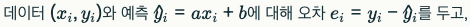 데이터 (x i ,y i )와 예측 y ^ i =ax i +b에 대해 오차 e i =y i − y ^ i 를 두고, 로스를 “오차들의 합”으로 만들고 싶지만, 그냥 ∑e i 로 두면 플러스/마이너스가 상쇄되어 문제가 생깁니다. 그래서 두 가지 대표 선택지를 소개합니다.